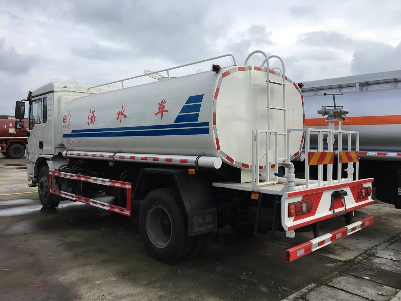 采用國標武鋼碳鋼板材制作,罐體實際容積12立方,前沖(噴)、后灑、帶側(cè)噴(花灑),帶后工作平臺,平臺上安裝鋼制芯專用大功率綠化灑水高炮(炮有直流狀、大雨、毛毛雨、霧狀可調(diào)節(jié),可噴灑農(nóng)藥),配備大功率專用灑水泵,帶消防接頭,帶自流閥,帶自吸功能。同時可以用于臨時應(yīng)急消防灑水,每輛灑水車都配備消防專用接口。由發(fā)動機帶動變速箱,變速箱上安裝的取力器帶動灑水泵,灑水泵產(chǎn)生主要動力,將罐體內(nèi)部的液體通過管網(wǎng)噴灑出去。自吸高度:≤7m,灑水寬度:≥20m,最大射程:≥28m;可調(diào)節(jié)成柱狀,射程≥28m;也可調(diào)節(jié)成霧狀,射程≥15m。前噴后灑,前裝有鴨形噴嘴或圓頭沖嘴,后面裝有圓柱開灑水噴嘴或蓮蓬頭噴嘴,后部有一工作平臺,裝配有高壓水炮。后部還可裝8個噴嘴(選裝)噴水器一般用于沖洗街道。可選配藥盤、打藥機。也可加裝藥盤、藥泵、罐內(nèi)防腐防銹、多方位進出水接頭、電磁閥、氣動閥等先進設(shè)施,以滿足不同用戶需求。