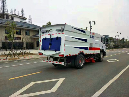 清掃車上裝配置:本洗掃車采用解放型國五二類底盤改裝,加裝康明斯170馬力副發動機、北玻臺信大功率耐磨免維護離心風機、16MPa高壓水泵、8.5/9.5立方米清水箱、7立方米垃圾箱、左右立掃、帶噴水桿的寬吸嘴、低壓沖洗系統、垃圾箱自潔,掃盤降塵系統,液壓系統、專用裝置電控系統和副車架等改裝而成。