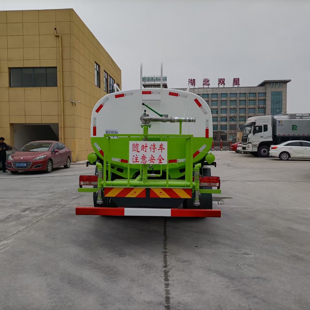 4.灑水車前噴頭位置較低,靠近地面,噴灑壓力較大,可用于沖洗路面;后噴頭位置較高(灑水車后噴頭一般左右各安裝一個),灑水面較寬,可用于公路施工灑水,使用后噴頭時,應將前噴管關閉;使用可調噴頭灑水時,灑水寬度可根據需要調整。灑水寬度越寬,中間重疊量越少,灑水密度越均勻。
