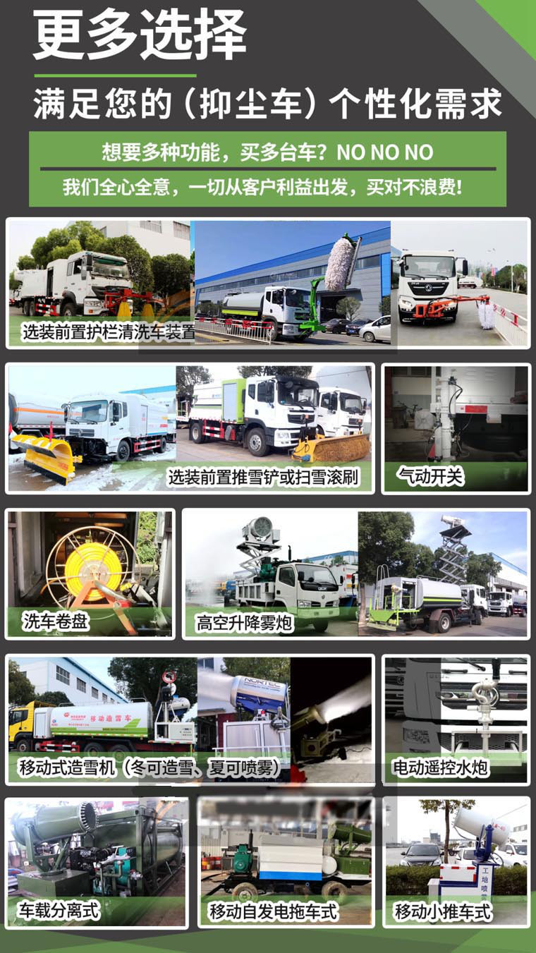 抑塵車配備大功率專用灑水泵,泵可自吸自排,安裝過濾網,帶消防接口,可通過消防栓進水,帶自流閥,隨車選裝20米綠化卷盤,可噴灑農藥,罐體金屬漆。罐體有橢圓和方圓罐兩種,可根據用戶的要求定做