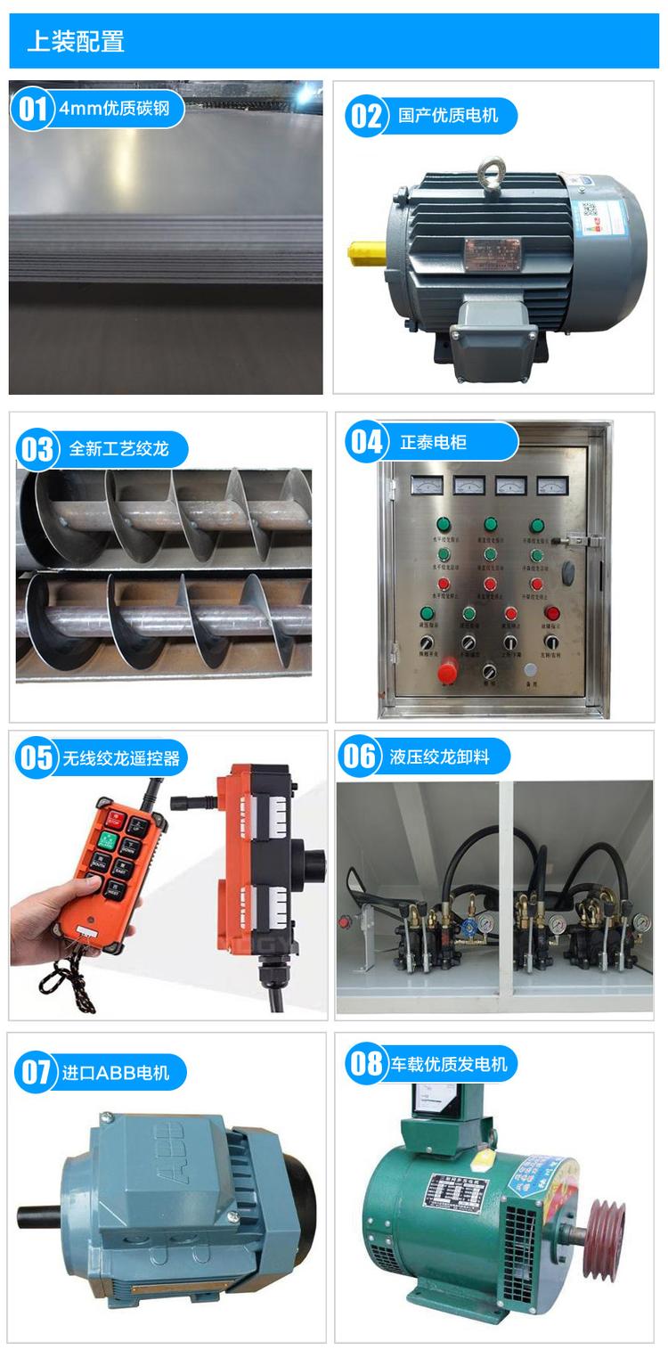 車輛參數配置:40方電動散裝飼料運輸車,采用解放前四后六底盤, 1900+4160+1350 軸距,錫柴 260/290 馬力,陜齒 9 檔變速箱,295 真空胎,電動門窗中控鎖,電動舉升,ABS,方向助力,上裝罐體容積約40立方,罐體采用4mm 鈦鋼板制作,罐體內分為肆個倉,可獨立控制各分倉卸料順序和速度,整車3條蛟龍(底部水平絞龍、尾部垂直絞龍、頂部卸料絞龍),由3個5.5kw 380v電機帶動各絞龍工作,頂部絞龍液壓控制舉升,可左右旋轉180°,整車尺寸:11000*2550*3995,罐體尺寸:8000*2550*2500,液壓款散裝飼料運輸車,通過變速箱帶動取力器取力后帶動各絞龍工作,采用進口液壓系統,確保產品質量,延長使用壽命