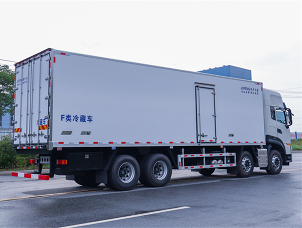 東風天龍9米6冷藏車車身配置為:東風天龍高頂雙臥駕駛室,國六東風DDI465馬力發動機,東風14檔變速箱, 11.00R20鋼絲胎,氣囊橋,斷氣剎,原廠空調,ABS,行車記錄儀,可選自動擋,液力緩速器。