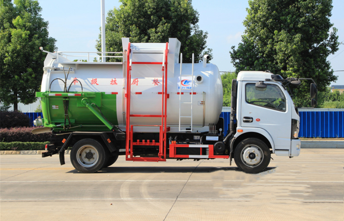 餐廚垃圾車是將桶裝“泔水”經該車輸送帶緩緩上輸,在車頂部倒入車廂內(車廂可分為方廂體和園罐體),被投放的垃圾經過強有力的推板擠壓,然后固液分離,被分離的液體進入罐體內底部的污水箱,固體垃圾被壓縮儲存在罐體內上部,體積變小,如此反復待裝滿后送至餐廚垃圾資源優化處理廠。整個過程,實現自動化。餐廚垃圾的分類收集,集中處理,實現后期無害化、資源化的處理設備首選,操作簡便安全,裝卸效率高且方便,主要適用于賓館,飯店,餐館,機關學校食堂等單位使用。