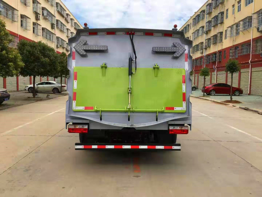 7. 垃圾箱采用雙層內膽不銹鋼結構,內部加裝過濾網板,能有效地防止樹葉、塑料袋之類的輕飄物堵塞風口及灰塵的排出。內置污水報警系統,通過后門處污水閥方便的將污水排至下水道,最大限度的利用了垃圾箱裝載垃圾的空間。廂體采用傾翻卸料,帶高壓沖洗自潔裝置。