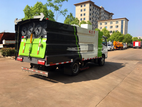 東風5噸洗掃車主要由二類載貨汽車底盤、水箱、低壓前沖、中置吸嘴(內置高壓噴水桿)、垃圾箱(集成水箱)、后噴霧等組成。具備: